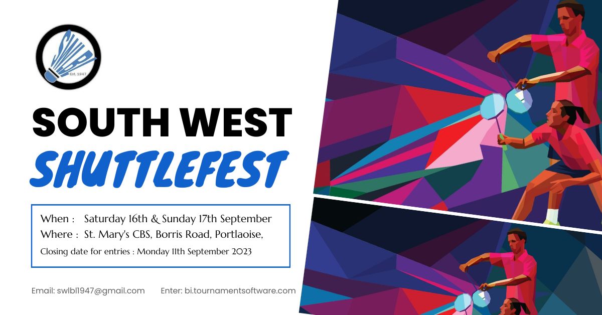 The South West Shuttlefest is a “kick-start” tournament which will be held in St. Mary’s CBS, Portlaoise, Co Laois in September. It is an partner rather than a team competition i.e. you enter with a partner in mixed and/or doubles and compete against other pairs in your grade. All are graded competitions from Grade 1 to Grade 6 with ladies, mens & mixed doubles competitions in each grade. All events are played as a round robin up to Semi-Final or Final stage.